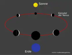 - ↑ Kepler schreibt in seinem 1619 veröffentlichten Werk Harmonices mundi libri V („Fünf Bücher zur Harmonik der Welt“): „Es ist so, wie wenn einer, der auf einem Papier einen Kreis beschreibt, den Schreibstift des Zirkels herumbewegt, ein anderer aber, der das Papier oder die Tafel auf einer Drehscheibe befestigt, den Stift oder Griffel des Zirkels festhält und den gleichen Kreis auf der rotierenden Tafel beschreibt.“ (Weltharmonik, Hrsg. Max Caspar, Neuauflage 2006, S. 286)
