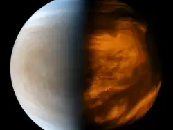 Die sphärische Albedo der cremegelben und zumeist strukturlosen Wolkenoberfläche beträgt 0,77; das heißt, sie streut 77 % des von der Sonne praktisch parallel eintreffenden Lichts zurück. Die Erde reflektiert dagegen im Mittel nur 30,6 %. Die von der Venus nicht reflektierte Strahlung wird zu rund zwei Dritteln von der Wolkendecke absorbiert. Diese Energie treibt die obersten äquatorialen Wolkenschichten zu einer Geschwindigkeit von etwa 100 m/s, mit der sie sich immer in Rotationsrichtung der Venus in nur vier Tagen einmal um den Planeten bewegen. Die Hochatmosphäre rotiert somit rund 60-mal schneller als die Venus selbst. Diese Erscheinung wird „Superrotation“ genannt. Der Grund dafür, warum die Auswirkungen gerade so und nicht anders ablaufen, war – zumindest im Fall der Venus – lange nicht befriedigend geklärt. Die Phänomene der Venusatmosphäre wurden mittels der Raumsonde Venus Express detailliert erforscht. Beispielsweise zeigte sich, dass innerhalb von zehn Venusjahren die Geschwindigkeit, mit der sich die Wolken um den Planeten bewegen, von 300 auf 400 km/h gestiegen ist.[14] Die einzigen anderen Beispiele für eine derart schnelle Atmosphärenzirkulation sind im Sonnensystem die Starkwindbänder in der höheren Atmosphäre der Erde und die Wolkenobergrenze des Saturnmondes Titan, dessen Stickstoffatmosphäre am Boden immerhin den anderthalbfachen Druck der irdischen Lufthülle hat. Eine Superrotation gibt es also nur bei den drei festen Weltkörpern des Sonnensystems, die eine dichte Atmosphäre besitzen. Mithilfe der Raumsonde Akatsuki konnte im Jahr 2020 eine durch die Sonneneinstrahlung hervorgerufene thermische Gezeitenwelle als Mechanismus identifiziert werden.[15]
