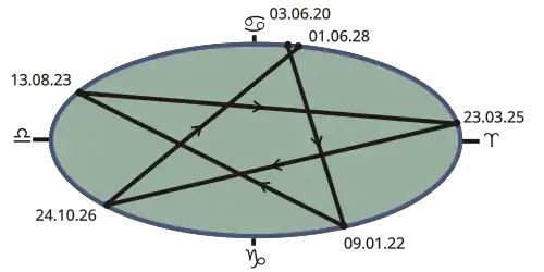 Die synodische Rotationsperiode der Venus (das heißt relativ zur Erde) beträgt im Mittel 145,928 Tage. Das ist der Turnus, mit dem ein Venusmeridian parallel zur heliozentrischen Länge der Erde liegt. Da die fünffache Periode auf wenige Stunden genau zwei Erdenjahren entspricht, ergibt sich eine annähernd pentagrammartige Verteilung dieser Stellungen. Nach Messungen der Raumsonde Venus Express ist die Rotationsdauer der Venus etwa 6,5 Minuten länger als von der Raumsonde Magellan gemessen.[4]