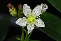 Die Pflanze bildet im Frühjahr einen bis zu 30 Zentimeter hohen Stängel aus, der verhindert, dass Bestäuber in die Fallen gelangen und verdaut werden. Die hauptsächlichen Bestäuber sind die Schwebfliegen Trichodes apivorus, Typocerus sinuatus und Augochlorella gratiosa. Dieser Stängel trägt mehrere weiße radiäre, zwittrige Blüten, die fünfzählig sind und einen Durchmesser von bis zu drei Zentimetern haben. Jede Blüte hat fünf grünliche Kelchblätter (Sepalen) und fünf nicht überlappende, weiße Kronblätter (Petalen). Die Pflanze ist dichogam. Wenn sich die Blüte öffnet, ist die Narbe noch nicht bereit Pollen aufzunehmen. Die Narbe ist ausgefranst, wenn sie reif ist.