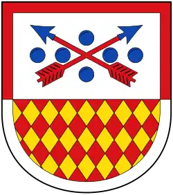Blasonierung: „In von Rot und Silber geteiltem Schildbord; geteilt, oben in Silber zwei gekreuzte rote Pfeile mit blauen Spitzen, begleitet von sechs (1:2:2:1) blauen Kugeln, unten Rot-Gold gerautet.“[9]