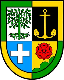 Die Wappenbeschreibung lautet: „In vierfach von Gold und Grün geteiltem Schildbord, in viergeteiltem Schild oben rechts in Silber eine bewurzelte grüne Buche, oben links in Schwarz ein goldener Anker, unten rechts in Blau ein schwebendes silbernes Kreuz, unten links in Gold über grünem Dreiberg eine rote Rose.“