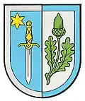Blasonierung: „In von Silber und Blau gespaltenem Schildbord, von Blau und Silber gespalten, rechts ein gestürztes silbernes Schwert mit goldenem Knauf, oben rechts bewinkelt von einem sechsstrahligen goldenen Stern, links eine grüne Eichel mit zwei grünen Eichenblättern.“[9] |