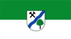 Blasonierung: „In Silber ein blauer linker Schrägfluß, begleitet oben von schräggekreuzte schwarze Schlägel und Eisen unten einen grünen Laubbaum mit schwarzem Stamm.“[4]