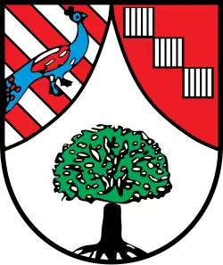 Blasonierung: „Rot bordiert; gespalten durch eine eingeschweifte silberne Spitze, darin eine grüne Linde mit schwarzem Stamm; vorn in Silber vier rote Schrägbalken, belegt mit einem nach links gewendeten blauen Pfau; hinten in Rot schrägrechts hintereinander drei silberne Rauten.“ |