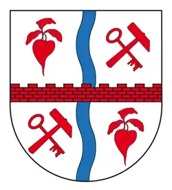 Blasonierung: „In Silber eine schwarzgefugte rote Mauer mit neun Zinnen in Spaltung mit einem blauen Wellenstab; Feld 1 und 4 eine rote Zuckerrübe, Feld 2 und 3 ein mit rotem Hammer schräggekreuzter roter Schlüssel.“[2]