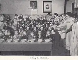 Im Jahre 1910 eröffnete der Verein gleichzeitig 13 Horte für insgesamt 600 bis 700 Kinder. Einen Hort durften die Kinder besuchen, „die auch seitens der Armenbehörden bereits als fürsorgepflichtig festgestellte waren“[2]. Im Jahre 1913 hatte der Verein beispielsweise an 1.069.483 Schulkinder Mittagessen verteilt, an nicht nichtschulpflichtige Kinder ca. 1000 Mittagessen: