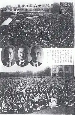 Die japanische Regierung regte mit dem Gesetz über die Religionsgemeinschaften die Vereinigung aller Kirchengründungen protestantischen Typs an. Am 17. Oktober 1940 fand eine große Versammlung christlicher Laien aus ganz Japan in Tokio statt, die das 2.600-jährige Bestehen des Japanischen Reiches feierten[5] und dabei den Wunsch nach Kircheneinheit formulierten.[4] Daraufhin kamen am 24. und 25. Juni 1941 Delegierte von über dreißig Kirchen in Fujimichio zur Gründung der Nihon Kirisuto Kyodan zusammen.[4] (Diese Kirchengründung war im Selbstverständnis der Vereinigten Kirche Christi in Japan durch das Wirken des Heiligen Geistes und aufgrund der göttlichen Vorsehung geschehen.[6]) Die Repräsentanten der Kirche begaben sich daraufhin zu den großen Schreinen von Ise, um am Shinto-Hauptheiligtum Amaterasu (der Sonnengottheit) die Kirchenunion mitzuteilen.[5] Die Repräsentanten der Nihon Kirisuto Kyodan erklärten, dass ihre Mitglieder japanische Staatsbürger seien, dass die Überwindung konfessioneller Grenzen ein Ausdruck ihrer Loyalität zu Japan sei, und dass sie den Kaiser zu unterstützen wünschten.[5]