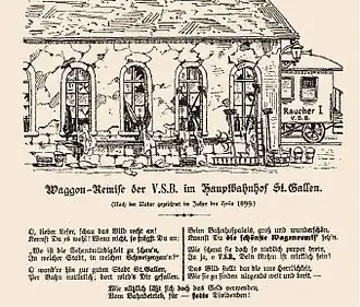 - Das eidgenössische Schützenfest in St. Gallen und der St. Galler Bahnhof. (PDF; 2,5 MB) In: Die Eisenbahn = Le chemin de fer. Band 3, Nr. 11, 1875, S. 97–98, abgerufen am 1. Februar 2014.
