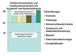 An Stelle der konventionellen Prüfung findet nun eine gestreckte Abschlussprüfung statt, bei der Teil 1 der Abschlussprüfung mit 25 %, Teil 2 mit 75 % gewichtet werden. Teil 1 besteht dabei aus einem über alle Fachrichtungen identischen Prüfungsprodukt einschließlich schriftlich zu lösender Aufgaben. In Teil 2 werden in den Fachrichtungen teilweise unterschiedliche Prüfungsinstrumente genutzt, zum Beispiel die Bearbeitung von Arbeitsaufgaben (mit und ohne situativem Fachgespräch) oder ein Variantenmodell (Fachrichtung Faserverbundtechnologie). In der Fachrichtung Bauteile findet zusätzlich eine Arbeitsprobe statt. Der Ausbildungsrahmenplan ist nun abstrakter formuliert; eine Trennung zwischen den Werkstoffen Metall und Kunststoff findet nicht statt. Die Qualifikationen zum Messen, Steuern und Regeln werden etwas umfangreicher als bisher vermittelt. Neu ist eine Vertiefungsphase von acht Wochen. Sie ermöglicht den Unternehmen, Inhalte aus bestimmten Berufsbildpositionen vertiefend zu vermitteln. Damit sollen Auszubildende bereits im ersten und zweiten Ausbildungsjahr auf die Inhalte der Fachrichtungen (drittes Ausbildungsjahr) vorbereitet werden.[3] Im schulischen Rahmenlehrplan wurden in den Fachrichtungen Mehrschichtkautschukteile und Faserverbundtechnologie das Lernfeld „Prüfen und Recyclen“ aufgenommen.