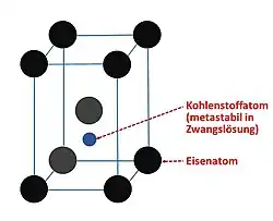 Kristallstruktur von Martensit: (tetragonale statt kubische Symmetrie wegen Kohlenstoffatom)