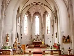- Die Kirche St. Michael im Ortsteil Veringendorf ist die älteste Kirche Hohenzollerns. Ihr Chor und die romanische Doppelturmanlage rühren ursprünglich aus einer Zeit um 1000.[26] Ursprünglich handelte es sich um eine dreischiffige romanische Basilika mit Chor und Türmen.[27] Die Fresken im Chor entstanden um 1320.[28] Die Kirche wurde 1400 erweitert, das Schiff stammt aus dem Jahr 1732.[29]