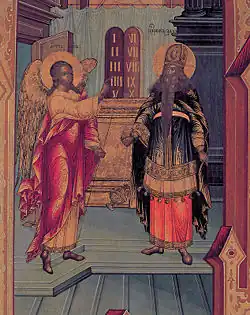 Im ersten Kapitel des Lukasevangeliums ist der erste Teil der Geburtsgeschichte Johannes des Täufers erzählt (Lk 1,5-22 ). Der Engel Gabriel kündigt dem greisen Zacharias während seines Priesterdienstes im Tempel zu Jerusalem die Geburt eines Sohnes an. Die Ehe mit seiner Frau Elisabeth war bis dahin kinderlos geblieben.