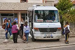 In einigen Städten gibt es Busterminals, andernorts halten die Busse und Furgons an einem bestimmten Platz oder den Ausfallstraßen. Ohne fest definierte Haltestellen und einen öffentlichen Fahrplan fällt Außenstehenden die Benutzung des öffentlichen Verkehrs oft sehr schwer.[78] In Tirana besteht neben dem Internationalen Busbahnhof und dem Busterminal für Südostalbanien der Terminal i transportit publik Tirana am westlichen Stadtrand, wo die meisten Busse halten. Hier soll zukünftig auch Tiranas neuer Bahnhof entstehen.