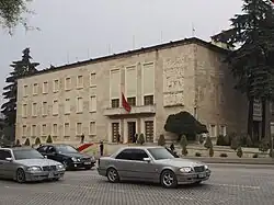 Viele Eisenbahnstrecken und auch einige Straßen wurden in vermeintlichen Freiwilligeneinsätzen von der Jugend des Landes errichtet.[11][23] Die einfachen Arbeitsmittel der jugendlichen „Freiwilligen“ brachten jedoch qualitative Probleme mit sich wie Unebenheiten und schlechten Oberbau.[24] 1946 sollen 5000 Freiwillige in lediglich fünf Monaten die 65 Kilometer lange „Straße der Jugend“ von Kukës nach Peshkopia erstellt haben, Ende der 1960er Jahre wurde in einer ähnlichen Aktion die „Straße des Großen Berglands“ nach Kelmend erbaut, womit auch der nördlichste Landesteil endlich motorisiert erreichbar war.[11][25][26] Viele der neuen Verkehrswege dienten der Erschließung von Bergwerksregionen oder den großen Wasserkraftwerken am Mat und Drin.[27]