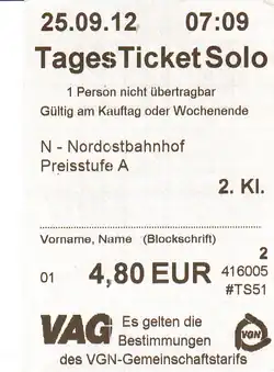 | Hotelfahrkarte | erhältlich für Gäste zahlreicher Hotels in Nürnberg, Fürth und Erlangen. Zwei aufeinanderfolgende Tage kann mit dem Ticket der ÖPNV ermäßigt genutzt werden |