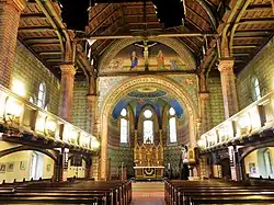 Die mit Kaseinfarben ausgeführten Malereien an der Decke der Apsis zeigen Darstellungen von Bethlehem und Jerusalem unter einem Sternenhimmel. Das Zentrum des Himmels bildet eine Sonne mit dem griechischen Monogramm für Jesus Christus. Darunter befinden sich die Symbole des Tierkreises sowie sechs Posaune blasende Engel. Die seitlichen Fenster sind in einfachen Motiven gehalten. Das große Kruzifix am Triumphbogen ist eine klassische Oberammergauer Arbeit. Der Kreuzigungsdarstellung des Johannesevangeliums folgend sind unter dem Kreuz Maria, die Mutter Jesu, sowie Johannes, der Lieblingsjünger Jesu, dargestellt. Außerdem hat der Maler der Kreuzigungsszene zwei Engel hinzugefügt. Der Altar ist ein hölzernes Schnitzwerk mit wenig Prunkbelag, geschaffen von Holzbildhauer Gustav Kuntzsch, Wernigerode. Insgesamt glänzt die Kirche vor allem wegen ihrer Prägung durch märkische Handwerksarbeit jener Zeit, vollständig aus Gestein und Gehölz der märkischen Gegend errichtet.