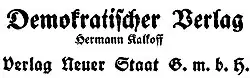 - ↑ Gründungsanzeige Demokratischer Verlag, 11. Dezember 1918, und Anzeige Zeitfragen-Verlag Hermann Kalkoff, 11. Dezember 1918, in: Börsenblatt für den deutschen Buchhandel Nr. 295, 21. Dezember 1918, S. 7415, Anzeigenteil (Digitalisat SLUB Dresden / Börsenblatt digital)