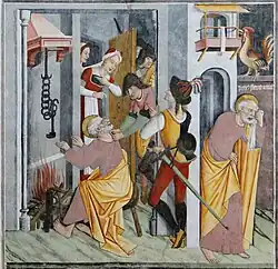 Um Jesu Gefangennahme zu verhindern, soll Petrus laut Joh 18,10 zum Schwert gegriffen und Malchus, der ein Diener des Hohepriesters war, ein Ohr abgeschlagen haben. Diese Szene des Ohrabtrennens wird auch bei Mk 14,47 par. berichtet, aber der Name des dafür verantwortlichen Dreinschlägers nicht angegeben. Jesus missbilligte dieses gewaltsame Vorgehen (Mt 26,52; Lk 22,51; Joh 18,11). Wie alle anderen Jünger floh dann auch Petrus (Mt. 26,56 par.).