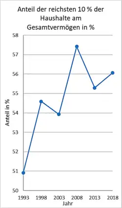 Der Gini-Koeffizient als Maß der Vermögensverteilung stieg von 0,777 im Jahr 2002 auf 0,799 im Jahr 2007 an.[25] Dabei bedeutet 0 eine vollständige Gleichverteilung (alle Personen besitzen gleich viel) und 1 die größtmögliche Ungleichverteilung (eine Person besitzt alles, alle anderen nichts). Den maßgeblichen Anteil für diesen Anstieg verzeichnet die Zunahme an Geldvermögen und dem Vermögen in Form privater Versicherungen.[26] Etwa die Hälfte der Bundesbürger hatte kein Vermögen und lebte unmittelbar vom Einkommen.[27]