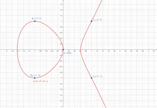 Dabei ist zu beachten, dass und analog . Ähnlich schnell lässt sich nachprüfen, dass die rationalen Punkte , , sowie auf der Kurve liegen.