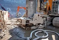 Eine Variante von Verrohrungsmaschinen sind Rohrdrehmaschinen. Diese treiben, wie die Drehbohrgeräte, das Bohrrohr durch eine kontinuierliche Drehbewegung und das Aufbringen von vertikalen Vorschubkräften in den Baugrund. Eine Erfindung von Theo Fromme und Josef Roob, die 1995 beim Deutschen Patentamt zum Patent angemeldet wurde,[1] kommt ohne ein externes Hydraulikaggregat aus. Dieses Gerät leitet das Drehmoment des Kraftdrehkopfes über die Kelly-Stange direkt in die Rohrdrehmaschine.