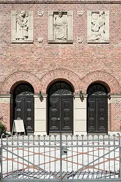 Die Reliefs über dem Haupteingang der Kirche schuf Wilhelm Rex im Jahr 1921: in der Mitte Jesus Christus, sitzend und mit segnend erhobener Hand, umgeben von vier kleinen Evangelisten-Medaillons, links von Christus eine Mutter mit Kind, rechts zwei Soldaten. Darunter ist der Bibelvers zu lesen, dem die Kirche ihren Namen verdankt: 2 Kor 5. So lasset euch versöhnen mit Gott.
