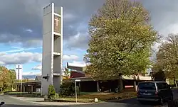 Die Kirche selbst bildet ein Sechseck, während die Gemeinderäume in U-Form einen Hof umgeben. Beide Bereiche sind vom Raumvolumen gleichwertig nebeneinander gestellt. Verbunden werden sie zweifach: Ein durchgehender, mit Waschbeton belegter Sockel hebt Kirche und Gemeindezentrum auf eine gemeinsame Ebene. Dieser Basis entspricht ein gemeinsames Dach, das das Gemeindezentrum bedeckt und um die über dieses Dach hinausragende Kirche einen Umgang bildet. Das Dach wird durch 32 Betonsäulen getragen. 24 Säulen umgeben die Anlage, je neun auf den Längs- und je fünf auf den Schmalseiten. Die Betonsäulen heben sich vom Hintergrund des roten Klinkers ab. Die Räume des Gemeindezentrums erhalten von ihnen einen optischen Umgang, der aber keine eigentliche Funktion besitzt. Um die Kirche tragen sie einen weiten Umgang, der zu begehen ist. Im Inneren der Anlage umgeben acht Betonsäulen einen vertieften und bepflanzten Hof, der von drei Seiten vom Gemeindezentrum eingefasst ist.