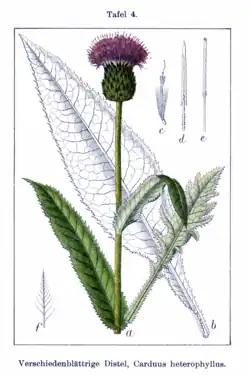 - ↑ Almut Weiskopf, Maria Romstöck, Albert Reif, Ernst-Detlef Schulze: Ökologische Untersuchungen an der Verschiedenblättrigen Kratzdistel (Cirsium helenioides (L.) Hill) in Oberfranken. Teil II: Heterophyllie und Standort. In: Tuexenia. Band 8, 1988, S. 149–161 (uni-freiburg.de [PDF; 2,0 MB]).