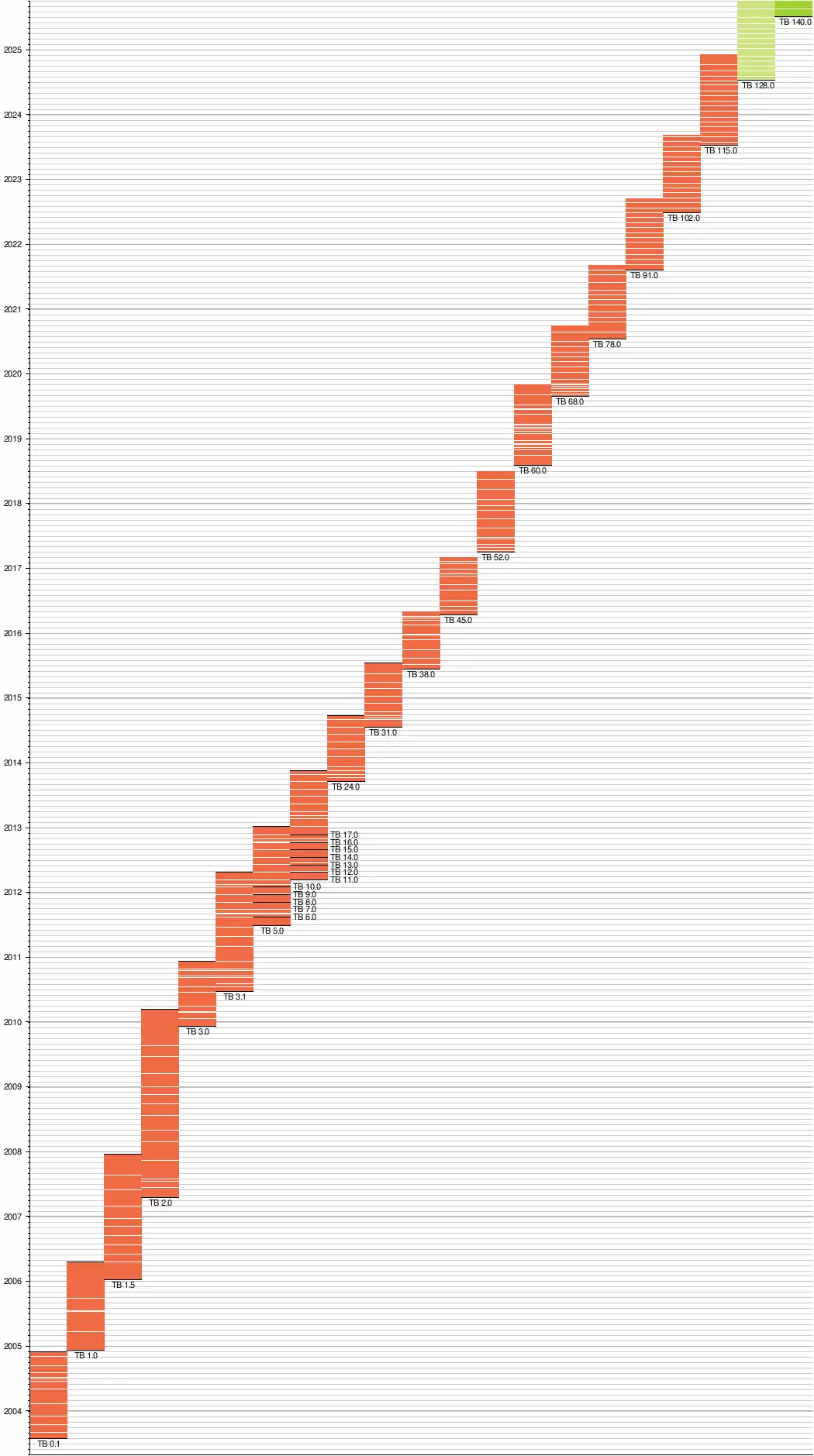 Das Schaubild stellt einzelne Versionen[1] von Mozilla Thunderbird nach ihrer Veröffentlichung geordnet auf einer Zeittafel dar und soll dem Überblick dienen. Einige Freigabetermine wurden verschoben, um Konflikte mit Feiertagen zu vermeiden. Analog zur Entwicklung bei Firefox ist bereits vor der Veröffentlichung neuer Versionen regelmäßig eine Beta-Version von Thunderbird verfügbar, die die Fehlerkorrekturen und gegebenenfalls auch neue Features von dem Webbrowser übernimmt.[2]