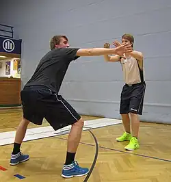 Darüber hinaus kann auch versucht werden zu verhindern, dass ein Angriffsspieler überhaupt den Ball bekommt. Einerseits kann dies durch Druck auf den Aufbauspieler oder durch Verstellen des Passweges (engl. overplay) erreicht werden. Ein Verteidiger steht so, dass er den Pass zwischen dem ballführenden Spieler und dem möglichen Empfänger behindert. Er verhindert entweder, dass der Pass überhaupt gespielt wird oder er spekuliert auf einen Ballgewinn (engl. steal), falls der Pass doch gespielt wird. Das Risiko hierbei ist, dass es bei Misserfolg zu sehr leichten Punkten für die gegnerische Mannschaft kommen kann. Deswegen wird diese Form meist versteckt gespielt, um dem Angreifer eine Falle zu stellen. Oft wird der Steal nicht durch den direkten Gegenspieler des ballführenden Spielers versucht.[11] Zusätzlich kann dem ballführenden Angreifer das Spielen eines Passes dadurch erschwert werden, dass man ihm eine Hand vor das Gesicht hält und so sein Sichtfeld entscheidend einschränkt.[12] Wird ein Pass gespielt, formiert sich die Verteidigung im Moment der Ballabgabe neu (nicht erst beim Fangen) und stellt sich auf den neuen ballführenden Spieler ein.