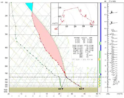 Es gibt verschiedene Darstellungsarten, z. B. das Stüve-Diagramm oder das Skew-T-Diagramm. Um die Orientierung zu erleichtern werden in das Diagramm verschiedene Hilfslinien eingetragen (vgl. nebenstehende Abbildung):[2]