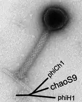 Auf das ChaoS9 stieß man, nachdem eine große Kultur von Archaeen des Stamms Halobacterium salinarum S9 spontan zusammengebrochen war. Wie sich herausstellte, war sie von dem Virus infiziert und lysiert worden.[6][7] Die Isolation des ChaoS9 genannten Virus aus dem Kulturlysat ergab eine homogene Population von Partikeln mit der Kopf-Schwanz-Morphologie der Caudoviricetes. Das Virus-Genom erwies sich als eine lineare, teilweise redundante und zirkulär permutierte dsDNA (Doppelstrang-DNA) mit einer Länge von 55.145 bp und einem G+C-Anteil von 65,3 %, nach Vorhersage 85 kodierenden Sequenzen (CDS) sowie einem tRNA-Gen für die Aminosäure Arginin (wie oben beschrieben).[7]