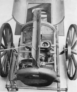 Die Hauptteile des Vorderwagens waren das Fahrgestell, ein Wagenkasten, eine Achse mit Rädern, eine Anspannvorrichtung mit Deichsel und eine Federprotzverbindung. Das Fahrgestell bestand aus zwei inneren und zwei äußeren, aus Stahl bestehenden U-Schienen, zwei vorderen und einer hinteren Querschiene. Diese waren durch Nieten zu einem rahmenartigen Gestell verbunden und wurden durch zwei weitere Verstrebungen aus flachen Stahlschienen versteift. Das Fahrgestell ruhte mit der gesamten Last hängend in zwei sechsteiligen Wagenfedern. Diese waren durch Federbügel an den äußeren Tragschienen drehbar gelagert.[2]