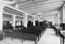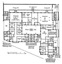 Wegen der unterschiedlichen Behörden sah Grässel vier Eingänge vor, von denen je einer in die getrennten Arbeitsamtsbereiche für Männer und Frauen im Erdgeschoss führte und die beiden anderen zu den Treppenhäusern, die den Zugang zu den Behörden mit weniger Publikumsverkehr in den oberen Stockwerken boten. Damit das Untergeschoss voll nutzbar war und um einen Höhenunterschied zum rückwärtigen Nachbargebäude auszugleichen, legte er den Fußboden des Erdgeschosses einen Meter über das Geländeniveau an der Frontseite, wodurch ein repräsentativer Haupteingang mit vorgelagerten Treppenstufen ermöglicht wurde. Die Raumhöhen wurden in den Stockwerken mit starkem Publikumsverkehr zwischen 3,50 und 4 m angesetzt, in den Obergeschossen mit Büros mit 3,30 m.[18] Ein Saal mit doppelter Raumhöhe erstreckte sich über zwei Geschosse und diente als Verhandlungsraum für das Gewerbegericht. Im Erdgeschoss lag eine Wohnung für den Hausmeister, während der Heizer eine kleine Dienstwohnung im vierten Obergeschoss hatte.[71]