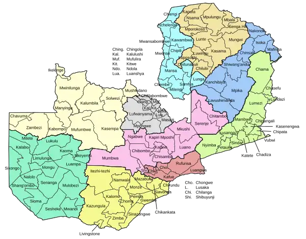 Die Zahl der Distrikte hat mit den Jahren stark zugenommen, auf derzeit 116 Distrikte (Stand: 2023). Beispielsweise wurden im Jahre 2018 per Dekret des Präsidenten Edgar Lungu 7 neue Distrikte geschaffen.[6]