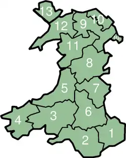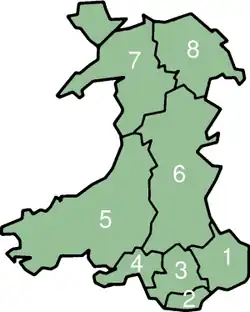 - Clwyd: Alyn and Deeside, Colwyn, Delyn, Glyndwr, Rhuddlan, Wrexham Maelor