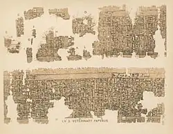 Der erste überlieferte Tierheilkundige war Urlugaledinna, der 2200 v. Chr. im sumerischen Lagaš in Mesopotamien lebte.[1] Der ägyptische Papyrus von Kahun von 1900 v. Chr. ist eines der ersten Dokumente, das Tierheilkunde belegt.[2]