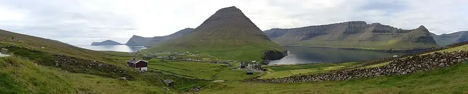 Viðareiði liegt lang gestreckt auf einer Landenge, eingebettet zwischen hohen Bergen im Norden und Süden.