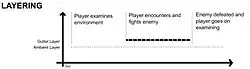 Die Layering-Technik funktioniert ähnlich wie die Branching-Methode. Zur Erklärung erwähnt van Geelen das Spiel Tomb Raider: Legend. Hier werde in Actionsequenzen häufig ein Gitarrenpart über den Ambient Track des Levels gelegt. Van Geelen bezweifelt, ob dieser Effekt ein stärkeres Eintauchen in die Spielwelt bewirkt, da der Effekt sehr voraussehbar scheine.