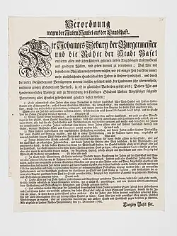 Die Basler Verordnung wegen der Juden Handel auf der Landschaft von 1768, heute im Jüdischen Museum der Schweiz, schränkte die Tätigkeiten der Juden stark ein, insbesondere im Bereich des Viehhandels.