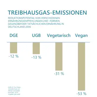 Für Deutschland konnte eine Studie aus dem Jahr 2014 feststellen, dass eine fleischlose Ernährung 31 % und eine vegane Ernährung (gänzlich ohne Tierprodukte) 53 % einspart, verglichen zur Durchschnittsernährung 2006.[40] Für Österreich berechnete eine Studie aus dem Jahr 2020 bei fleischloser Ernährung 47 % CO2-Einsparungen, bei veganer 70 %, verglichen mit der Durchschnittsernährung.[41][42]