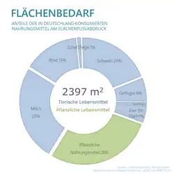 Für Deutschland konnte eine Studie aus dem Jahr 2014 feststellen, dass eine vegane Ernährung (gänzlich ohne Tierprodukte) 50 % Fläche einspart, verglichen zur Durchschnittsernährung 2006.[51] Für Österreich berechnete eine Studie aus dem Jahr 2020 bei fleischloser Ernährung 41 % Einsparungen, bei veganer 65 %, verglichen mit der Durchschnittsernährung.[52][42]