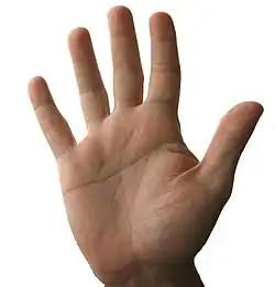 Die Vierfingerfurche ist eine durchgehende Beugefalte palmar (d. h. am Handteller), die senkrecht zu den Längsachsen der Finger verläuft und vom Klein- bis Zeigefinger reicht. Sie verläuft parallel zu den Fingergrundgelenken. Furchungen der Handinnenflächen (Handlinien) treten bei allen Menschen auf. Meist sind diese Furchen gerundet, verlaufen also nicht gerade, sondern in individuell geschwungenen Bögen.[1][2]