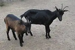 Die Vierhornziege ist eine Mutante der Hausziege (Capra aegagrus hircus) mit vier statt zwei Hörnern, die erstmals in den österreichischen Alpen auftrat. Die Vierhornigkeit wird dominant und unabhängig von der Färbung vererbt.[1] Daher wurden zahlreiche Rassen von Hausziegen eingekreuzt, wobei Tauernschecken, Pfauenziegen und Pinzgauer Strahlenziegen beteiligt waren. Obwohl die Vierhornziege noch nicht als eigene Rasse anerkannt ist, wird sie im Rahmen von Erhaltungs- und Genressourcen-Studien wie andere gefährdete Haustierrassen beobachtet. Der Handlungsbedarf zu ihrer Erhaltung wird als akut eingestuft.[2]