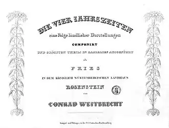 Gleichzeitig mit den Entwürfen für den Fries schuf Weitbrecht Zeichnungen für einen Jahreszeitenzyklus, der fast doppelt so viel Blätter (70) wie Friesszenen (38) enthielt. Dabei griff er wie auch bei den Friesentwürfen auf seinen Jahreszeitenzyklus zurück, der bereits 1818–1822 entstanden war. Die Zeichnungen ließ Weitbrecht von Carl Heinrich Wenng lithografieren, der 1816–1827 Professor der Zeichenkunst an der Königlichen Lithographischen Anstalt in Stuttgart war und dann nach München ging. Weitbrecht war mit Wenngs Arbeit sehr zufrieden.[30] Die einzelnen Blätter tragen rechts oben eine Nummer, die aus dem Anfangsbuchstaben der Jahreszeit und einer fortlaufenden römischen Zahl besteht (Beispiel: F VII = Frühling, Lithografie Nr. 7) und sind unten links mit „Weitbrecht inv.“ und rechts mit der des Lithographensignatur „Wenng sc. München 1828“ versehen (statt „sc.“ kann auch „gr.“ oder „gestochen“ stehen).[31]