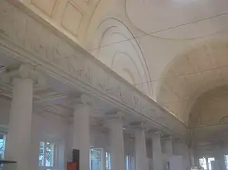 Der Architrav stützt sich auf je sechs ionische Säulen, die das Mittelschiff von den Seitenschiffen trennen, und je 2 ionische Säulen an den Schmalseiten. Darüber ist der Vierjahreszeitenfries angebracht. Der fast einen Meter hohe Fries hat eine Gesamtlänge von rund 65 Metern, die sich mit je 25 Meter auf die Längsseiten und je 7,5 Meter auf die Schmalseiten verteilt.[1]