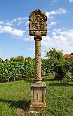 Der sogenannte Vierzehnheiligenbildstock steht am Rande des Weindorfes Nordheim am Main am Hallburger Weg, der zur gleichnamigen Burg führt.