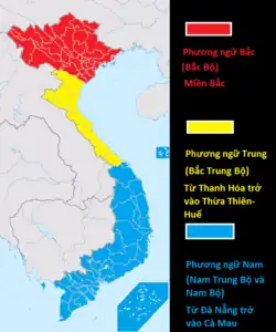 Karte der Verbreitung der drei wichtigsten Dialektregionen der vietnamesischen Sprache in Vietnam.