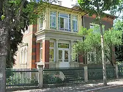 In der Hauptansicht zur Heinrich-Heine-Straße steht ein Seitenrisalit, dazu ein rundbogiges Koppelfenster im Erdgeschoss. In der anderen Straßenansicht steht ebenfalls ein Seitenrisalit auf der rechten Seite, links daneben eine zweigeschossige massive und verglaste Veranda mit Holzzierrat im Obergeschoss.